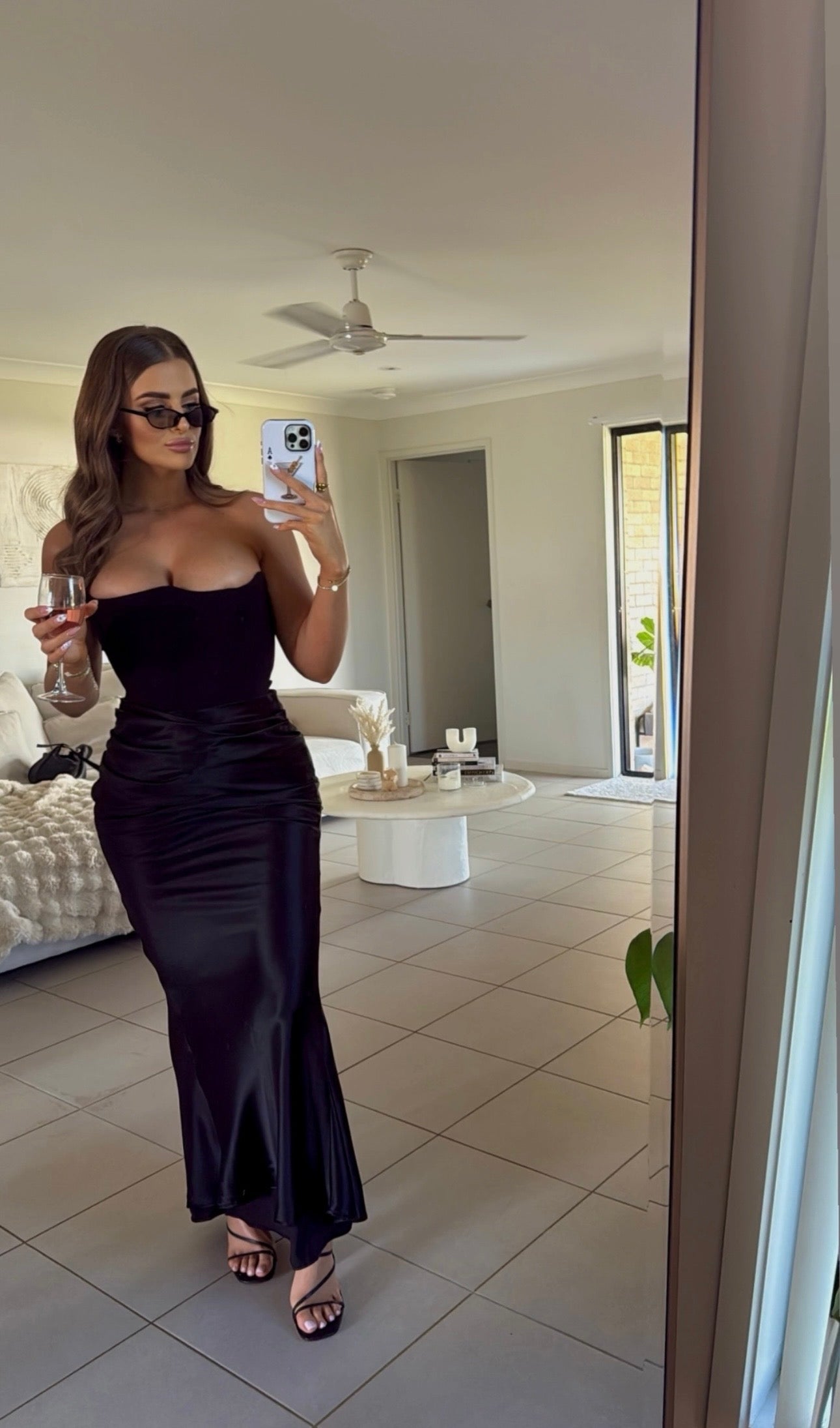Cut from stretch crepe and ultra luxe silky satin, it has a stunning strapless neckline and a perfectly boned bodice to cinch the waist.